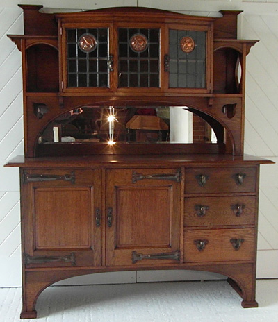 Arts & Crafts oak dresser with 3 leaded glass panels incorporating stylised copper roundels and cut out decoration. Waring & Gillow (stamped drawer) Circa 1900