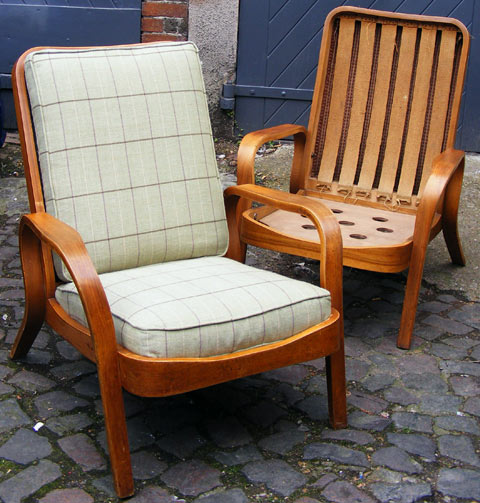 Pair of easy armchairs in laminated walnut. Designed by Eric Lyons Made by the Packet Furniture Company ltd Circa 1950